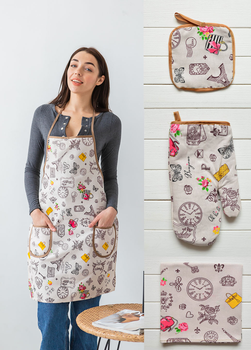 Функціональність: Рукавиця та прихватка витримують високу температуру, рушник добре вбирає вологу, а фартух захищає одяг.