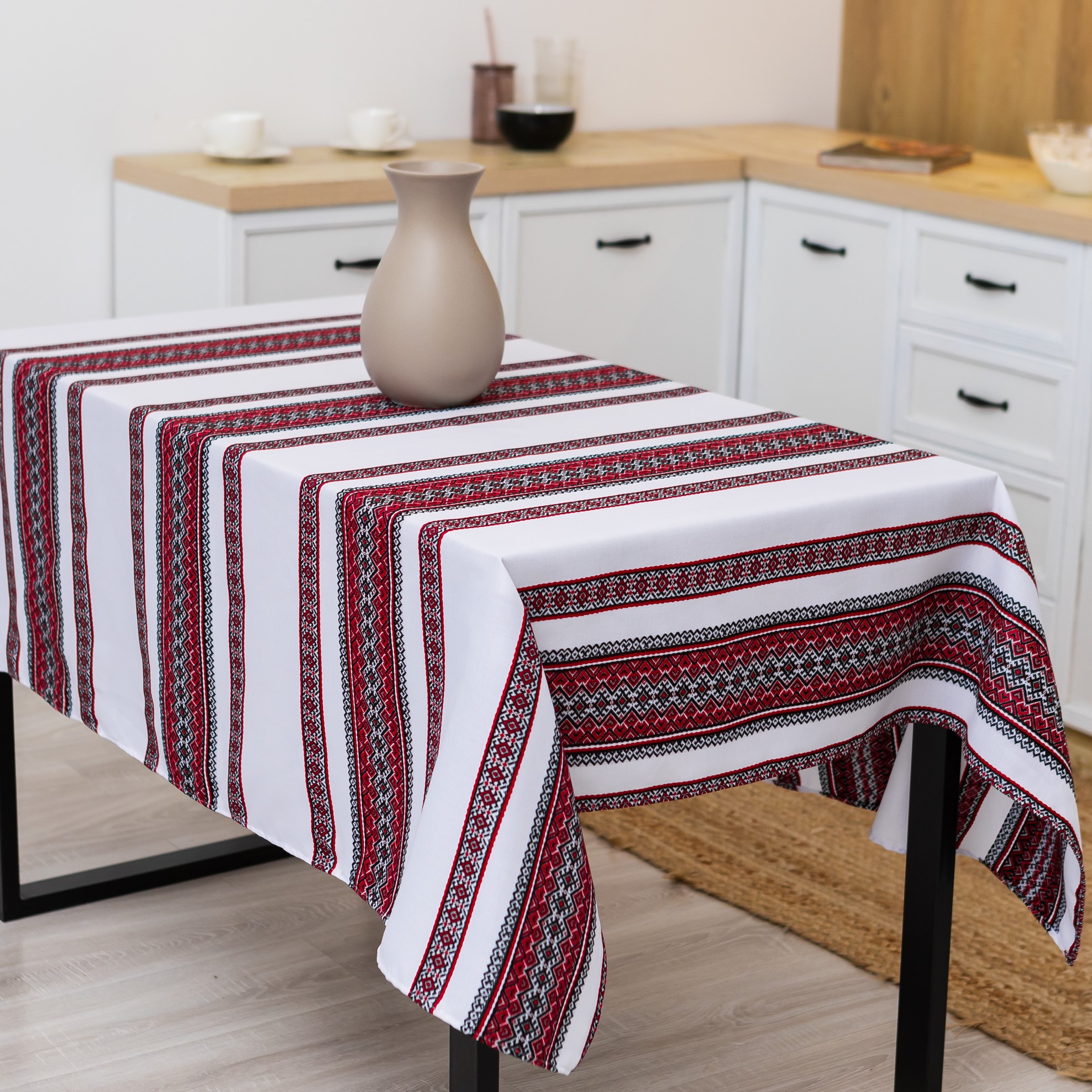 Скатертина з українським вишитим орнаментом, напівбавовна 220 Х 150 см – етностиль для дому та свят (анс1-1-22)
